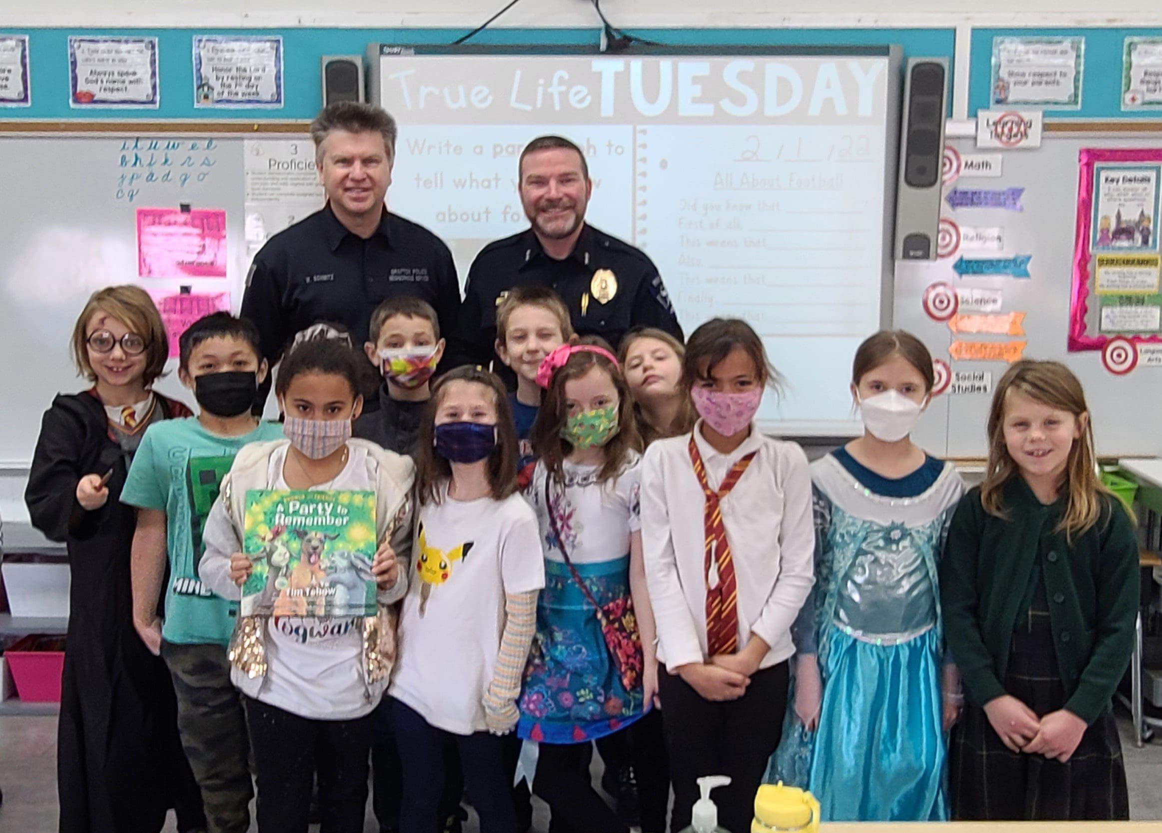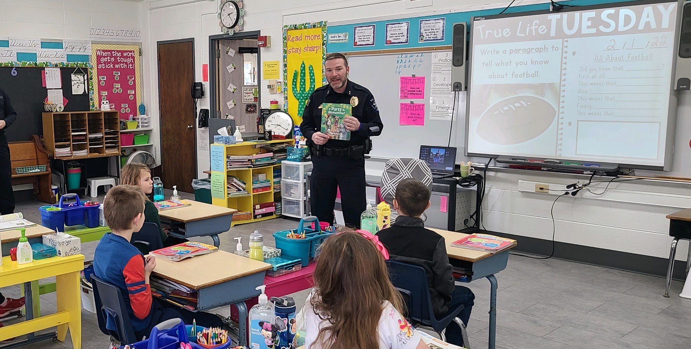 St. Joseph Grafton held a parents/teachers vs. eighth-graders volleyball game. The parents wore shirts with baby pictures of their students. Below: The second-graders had Grafton Police Chief Jeff Caponera as a guest reader. (Submitted photos)
