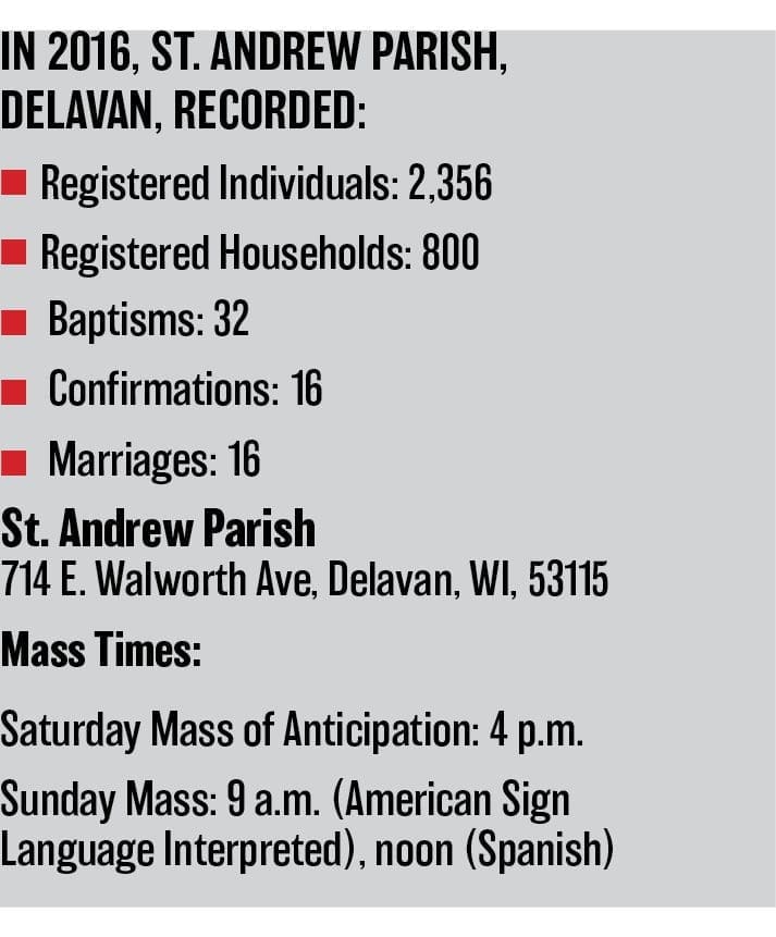 “St. Andrew is in the absolute center geographic location in Delavan at the intersection of highways 50 and 11, so this church campus has always been in the center of town,” said Tim O’Neill, a third-generation parishioner who also happens to be Delavan’s police chief. “When the parish decided to build at the intersection of (what became) two state highways, there was some thought as to why that location was good. When you drive into Delavan, you see St. Andrew’s church steeple. I think it’s been a pillar of the community.”