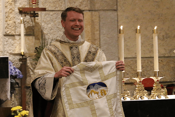 Fr. Patrick Magnor, Parish Administrator of the Kewaskum parishes of St. Michael’s and Holy Trinity, holds up a chasuble [...]