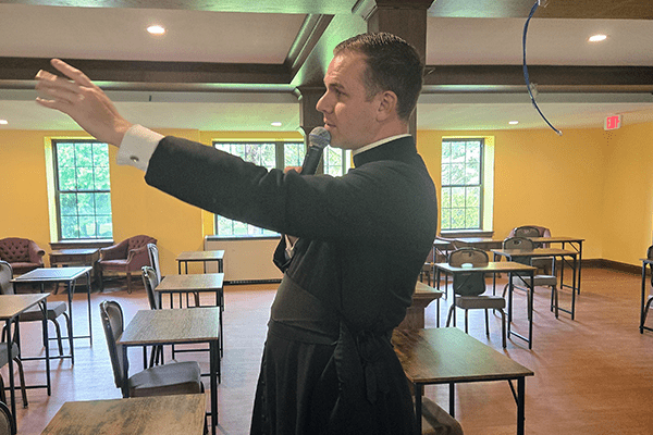 Rev. Canon Andrew Todd speaks in a lecture room during tours of the newly renovated Sacred Heart Retreat Center, [...]
