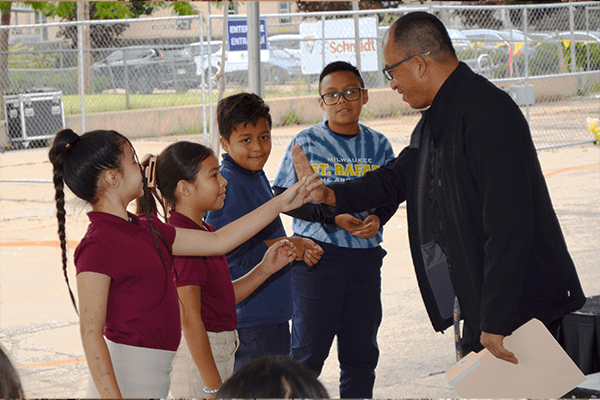 Tim Kasprzak, alumnus and new principal of St. Matthias, shares a lighter moment with middle schoolers at the Milwaukee [...]