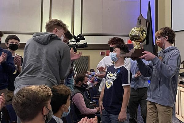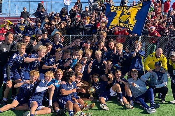 Members of Marquette University High School's boys volleyball team celebrate their state championship at an event at the school [...]