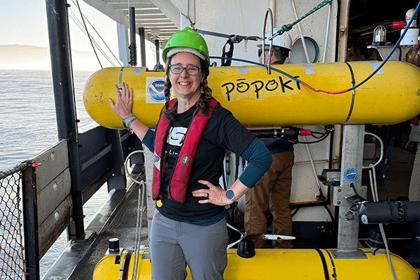 Lisa Werner, a music teacher at St. Bruno School in Dousman, poses next to Popoki, the guided vehicle used [...]