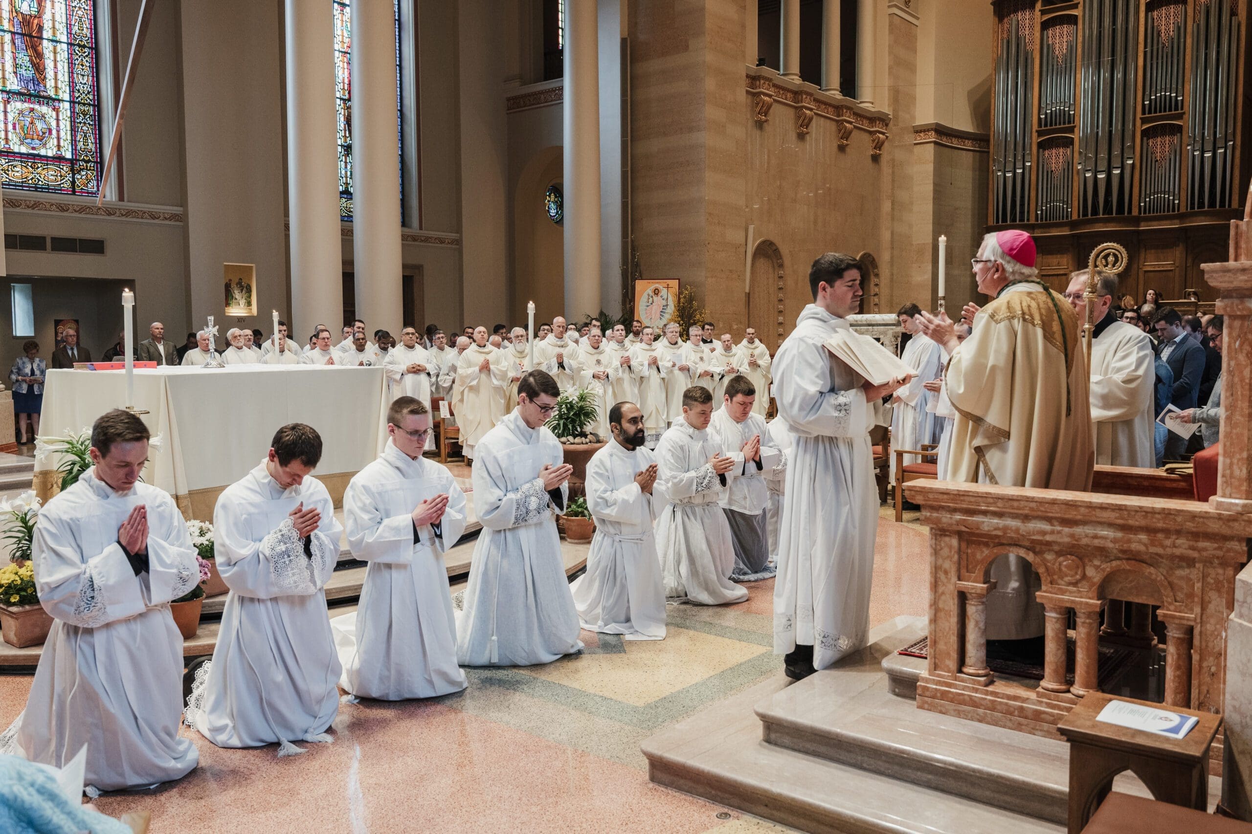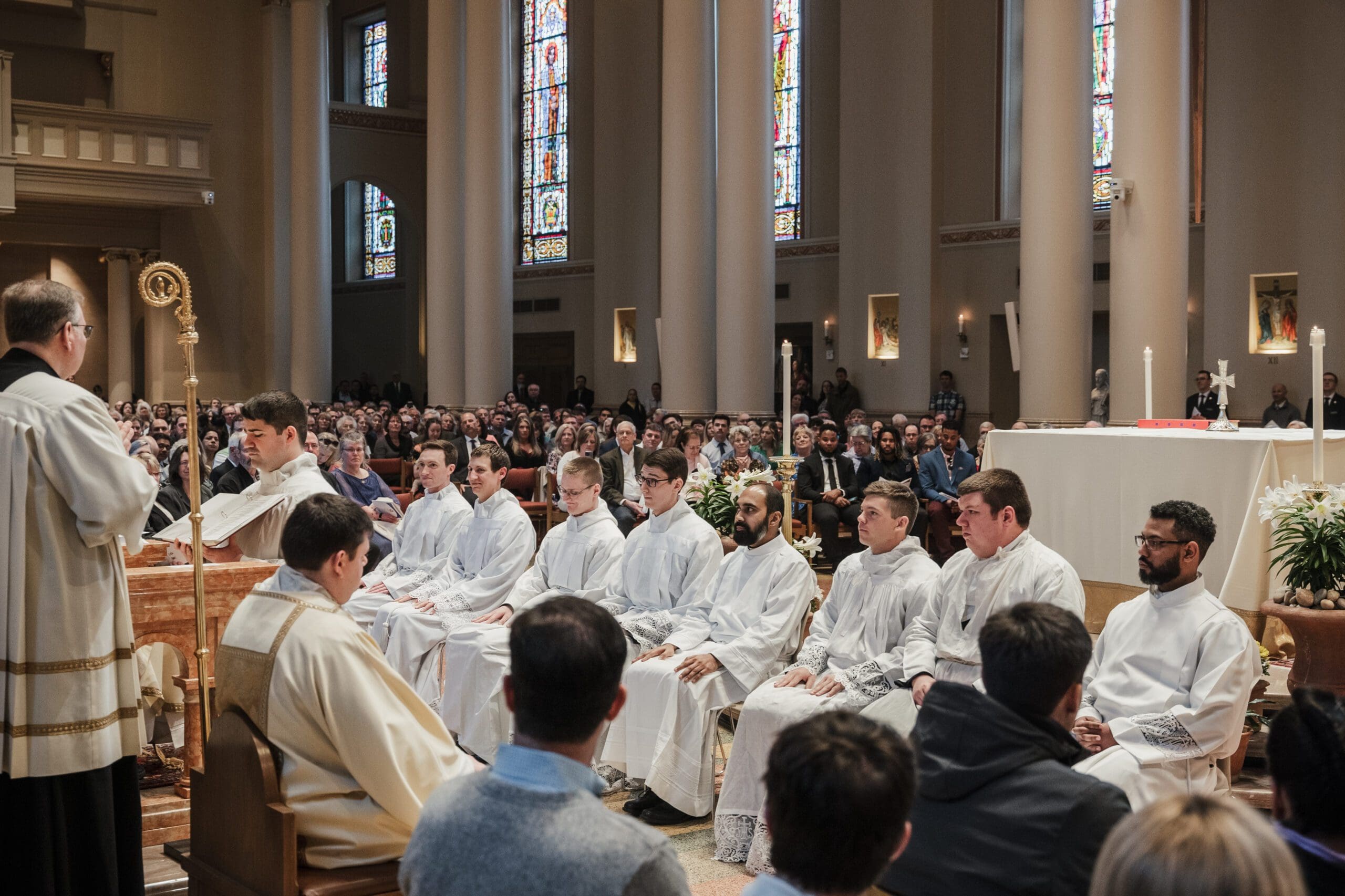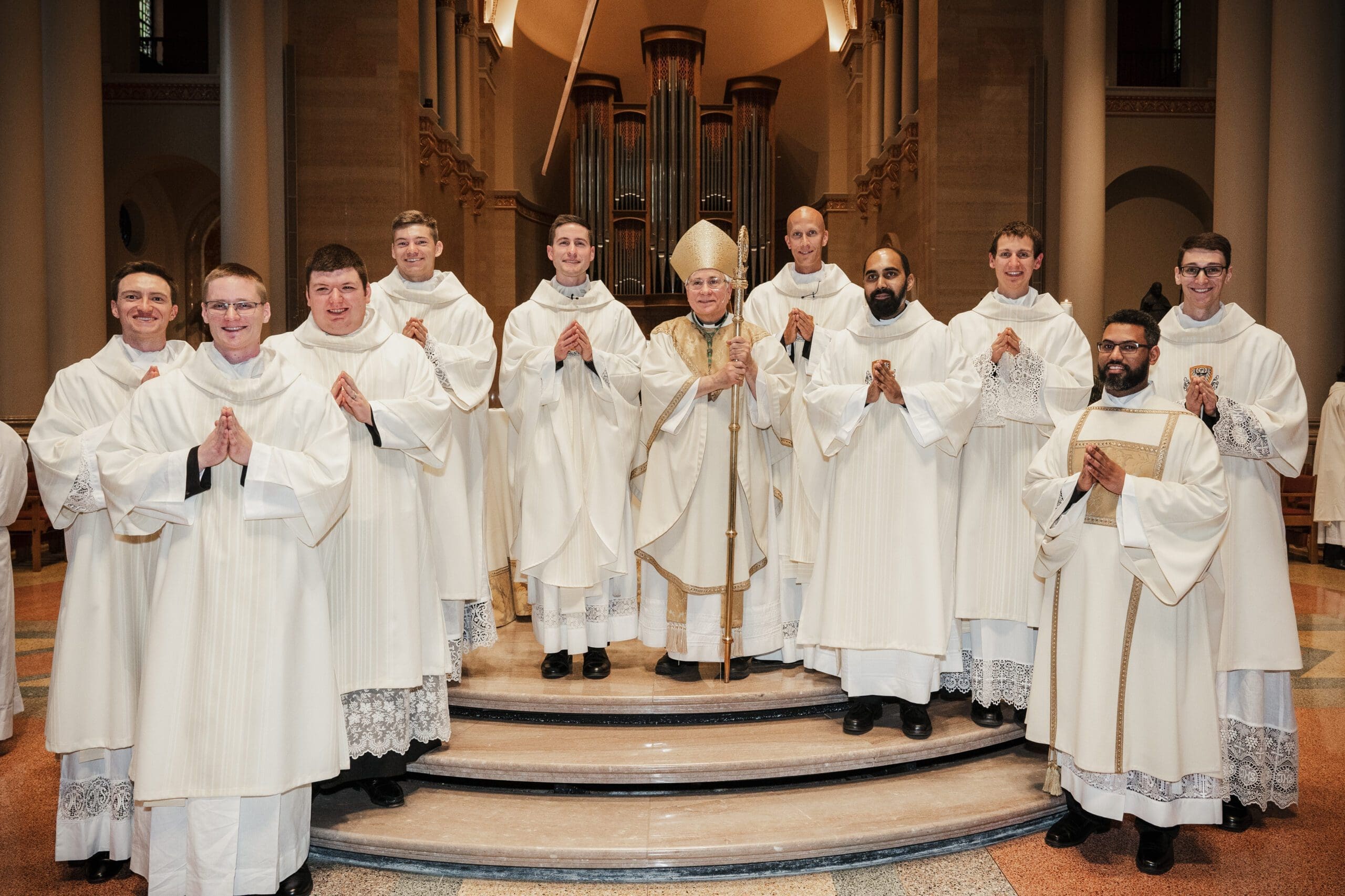 Bishop Jeffrey Haines presided over the ordination of eight new transitional deacons Saturday, April 22, at the Cathedral of St. John the Evangelist. (Photo courtesy of Saint Francis de Sales Seminary)