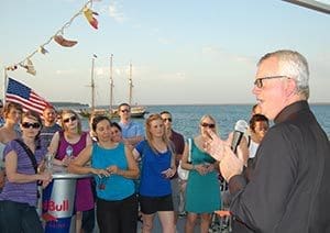 Bishop Donald J. Hying speaks with young adults during a Lolek “Boating with the Bishop” outing for young adults in July 2012. (Catholic Herald photo by Tracy Rusch)