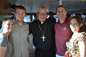 Bishop Donald J. Hying poses with Talia Westerby, Carl Westerby, Peter Machi and Jessica Machi during a Lolek “Boating with the Bishop” outing for young adults in August 2013. (Submitted photo courtesy Lolek)