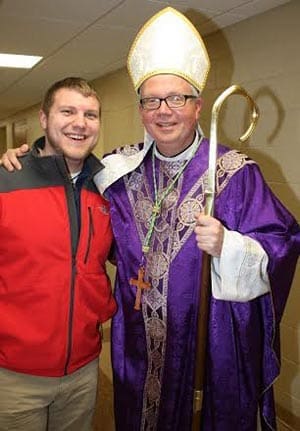 Andrew Schueller, director of student and young adult ministries at St. Charles Parish, Hartland, poses with Bishop Donald J. Hying at the Wisconsin Catholic Youth Rally. (Submitted photo courtesy Andrew Schueller)Fr. Wrobel said Bishop Hying as a rector was always a good sport about the hijinks of his students – even when several seminarians snuck into Bishop Hying’s bathroom and installed a deer head above his toilet.