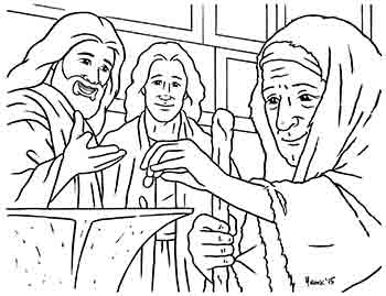 Jesus watches the people – including a poor widow – throw their coins into the chests. Many rich people put in large amounts of money.