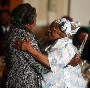 Mildred Webster, left, founder of the first Milwaukee Knights of Peter Claver and Ladies Auxiliary Court and Council with Capuchin Br. Booker Ashe in 1982 is congratulated by her friend from Chicago, Annetta Wilson, at the Sheraton Milwaukee Brookfield Hotel, Saturday, Feb. 7. (Catholic Herald photo by Allen Fredrickson)