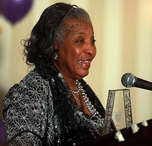 Mildred Webster, a member of Blessed Savior Parish, Milwaukee, is honored with the Community Servant Award on Saturday, Feb. 7, at the Knights of Peter Claver and Ladies Auxiliary Mardi Gras Scholarship Ball, at the Sheraton Milwaukee Brookfield Hotel. (Catholic Herald photo by Allen Fredrickson)