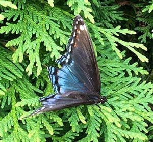 Columnist Michele Campbell looks upon the arrival of this royal blue butter y in her backyard as a God moment, a symbol of a new beginning and God’s assurance that everything would be OK. (Submitted photo by Michele Campbell)
