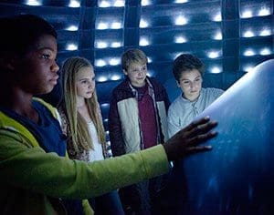 Brian Bradley, Ella Linnea Wahlstedt, Reese Hartwig and Teo Halm star in scene from movie “Earth to Echo.” Th Catholic News Service classification is A-II – adults and adolescents. The Motion Picture Association of America rating is PG – parental guidance suggested. Some material may not be suitable for children. (CNS photo/Patrick Wymore, Relativity Media)