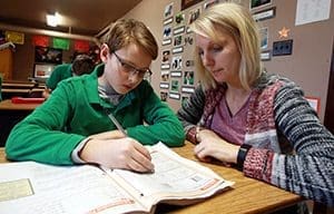 St. Andrew School, Delavan fifth-grade teacher Janel Karsten helps sixth-grader, John Moses work on a math problem on Tuesday, Jan. 13. They are using one of the math books donated by the Sklenar adult children in memory of their parents, Julius and Carolyn Sklenar. (Catholic Herald photo by Allen Fredrickson)