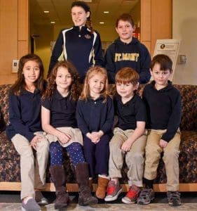 Ana Ryan, front row, left to right, Lauren Ryan, Avery Ryan, Lorenzo Pluer and John Ryan, and back row, Sarah and Joe Pfeifer, are among the second generations of students attending St. Mary School, Hales Corners. (Catholic Herald photo by Juan C. Medina)