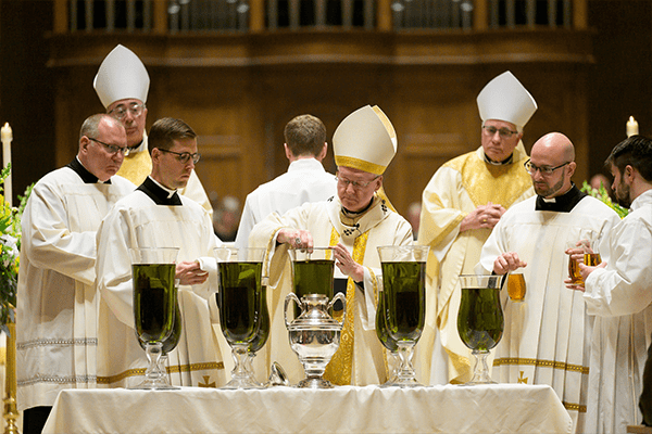 Archbishop Jeffrey S. Grob stirs sweet-smelling balsam into oil to be consecrated as chrism for sacramental use at all parishes during the Chrism Mass celebrated March 31 at the Cathedral of St. John the Evangelist, Milwaukee. (Photo by Chris Plamann)