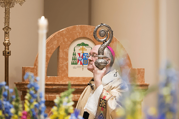 Archbishop Jeffrey S. Grob is the celebrant at the Easter Vigil held at the Cathedral of St. John the Evangelist, Milwaukee, on April 4. On Easter Sunday, he celebrated Mass at St. Agnes, Butler. (Photo by Chris Plamann)