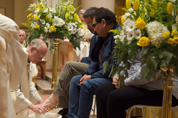 Archbishop Jeffrey S. Grob washes the feet of a man during Holy Thursday Mass on April 2 at the Cathedral of St. John the Evangelist, Milwaukee. (Photo by seancsmithphotos.com)