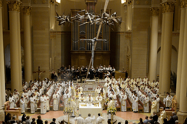 Priests of the Archdiocese of Milwaukee gather with Archbishop Jeffrey S. Grob at the Chrism Mass at the Cathedral of St. John the Evangelist, Milwaukee, renewing their priestly promises as sacred oils are blessed for use throughout the coming year. (Photo by Chris Plamann)