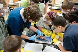 Cathy Ferderbar, science teacher at St. Mary School, Menomonee Falls, and her students dissect an animal in the school’s science lab. Ferdebar received the 2014 Celebrate Teachers and Teaching Award from the Education Deans of Greater Milwaukee last fall. (Submitted photo courtesy St. Mary School, Menomonee Falls)An alumna of St. Mary Parish School, Cathy Ferderbar has taught science at her alma mater since her daughter Elizabeth, a veterinarian in Rochester, New York, was in kindergarten. She also has a son, Matthew, a social scientist for the conservation district in Fairbanks, Alaska.