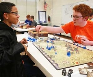 Noah Tyler, left, and Dominic Zagra, seventh graders, play a Civil War game during a J-Term session, Monday, Jan. 9, at St. Joseph Academy, Kenosha. (Catholic Herald photo by Allen Fredrickson)