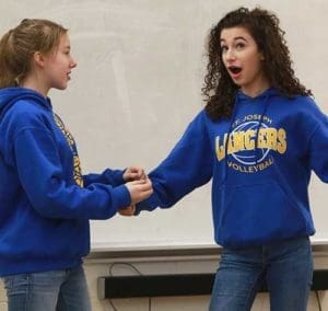 Ninth graders Julia Laventhall and Alex Daher, participate in an improvisational class during St. Joseph Academy, Kenosha’s J-term, on Monday, Jan. 9. (Catholic Herald photo by Allen Fredrickson)
