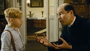 In the wake of James’ emotionally wrenching departure for the war, Pepper’s kindly parish priest, Fr. Oliver (Tom Wilkinson), tries to help the 7-year-old recognize the difference between mere wish-fulfillment and trust in God’s providence. He presents Pepper with a list of the corporal works of mercy, and encourages the boy to carry them out as a tangible demonstration of his pious devotion.