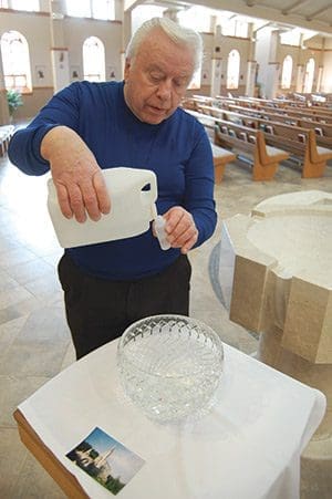 Lourdes Volunteer, Ken Theys, a member of St. Martin of Tours Parish, Franklin, pours water from the shrine in Lourdes into small containers, on Thursday, Feb. 4 at his parish. Theys has made seven trips to Lourdes, France, as a volunteer. A photo of the Basilica of Our Lady of the Rosary in Lourdes is visible on the table. (Catholic Herald photo by Ricardo Torres)Miraculous cures have been recorded there and the site has grown to consist of seven churches, five conference rooms and hotels for the sick.