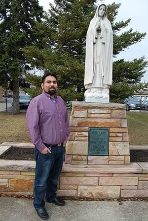 Adrian Lynch stands in front of a statue of Our Lady of Fatima outside of St. John Paul II Parish, Milwaukee, where he serves as youth director. Lynch also coaches volleyball and softball for the parish schools, and basketball and soccer for Nativity Jesuit Middle School, Milwaukee. (Catholic Herald photo by Ricardo Torres)Milwaukee-native Adrian Lynch, 27, works as youth ministry director at St. John Paul II Parish in Milwaukee, teaches confirmation classes and helps with the St. Vincent de Paul meal program. He said he does “basically, anything that deals with youth.” When he’s not acting as director, he has been volunteering for two years at Casa Romero Renewal Center, an urban and bilingual spirituality center serving Milwaukee and southeastern Wisconsin. People may also hear kids calling him “coach” as he coaches soccer and basketball at Nativity Jesuit Middle School, Milwaukee, and volleyball and softball at his parish’s schools. Adrian, the middle child of three, grew up in the food business and wants to open his own restaurant and become a philanthropist.