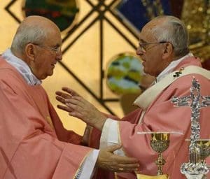 Pope Francis, wearing rose-colored vestments, exchanges the sign of peace with Cardinal Agostino Vallini, papal vicar for Rome, also wearing rose-colored vestments, while celebrating Mass during a visit to St. Joseph Parish in Rome Dec. 14. (CNS photo/Paul Haring)