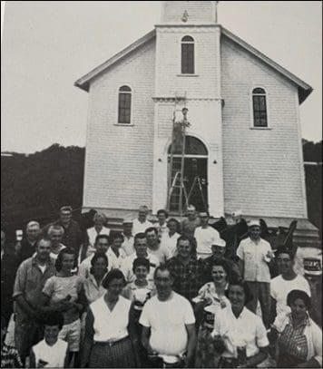 Charter parishioners prepare St. Eugene’s little white chapel in June 1957. (Submitted photo)