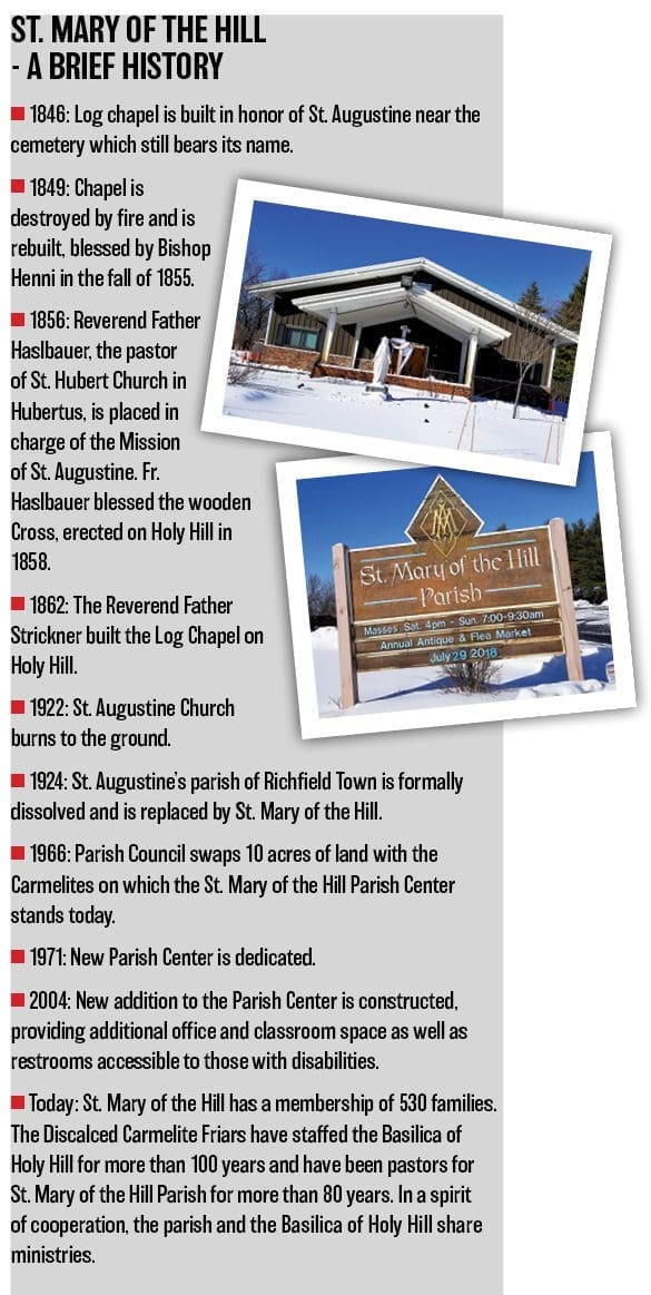 Thus, a new church was built at the base of Holy Hill and on Sept. 22, 1924, St. Mary of the Hill Parish was dedicated by Archbishop Sebastian Messmer. Although some families at the time decided to attend either St. Mary’s Church in Richfield or St. Hubert’s in Hubertus, a strong core of more than 50 families took Archbishop Messmer’s advice and made St. Mary of the Hill their new home. Masses and church services were held in a small chapel, which served as a temporary church. Once the Holy Hill Shrine was completed, parishioners joined pilgrims in worshipping there. In 1971, the new parish center was dedicated and has since served as the worship site for St. Mary of the Hill. A new addition in 2004 provided additional office space, classroom space and restrooms for those with disabilities.