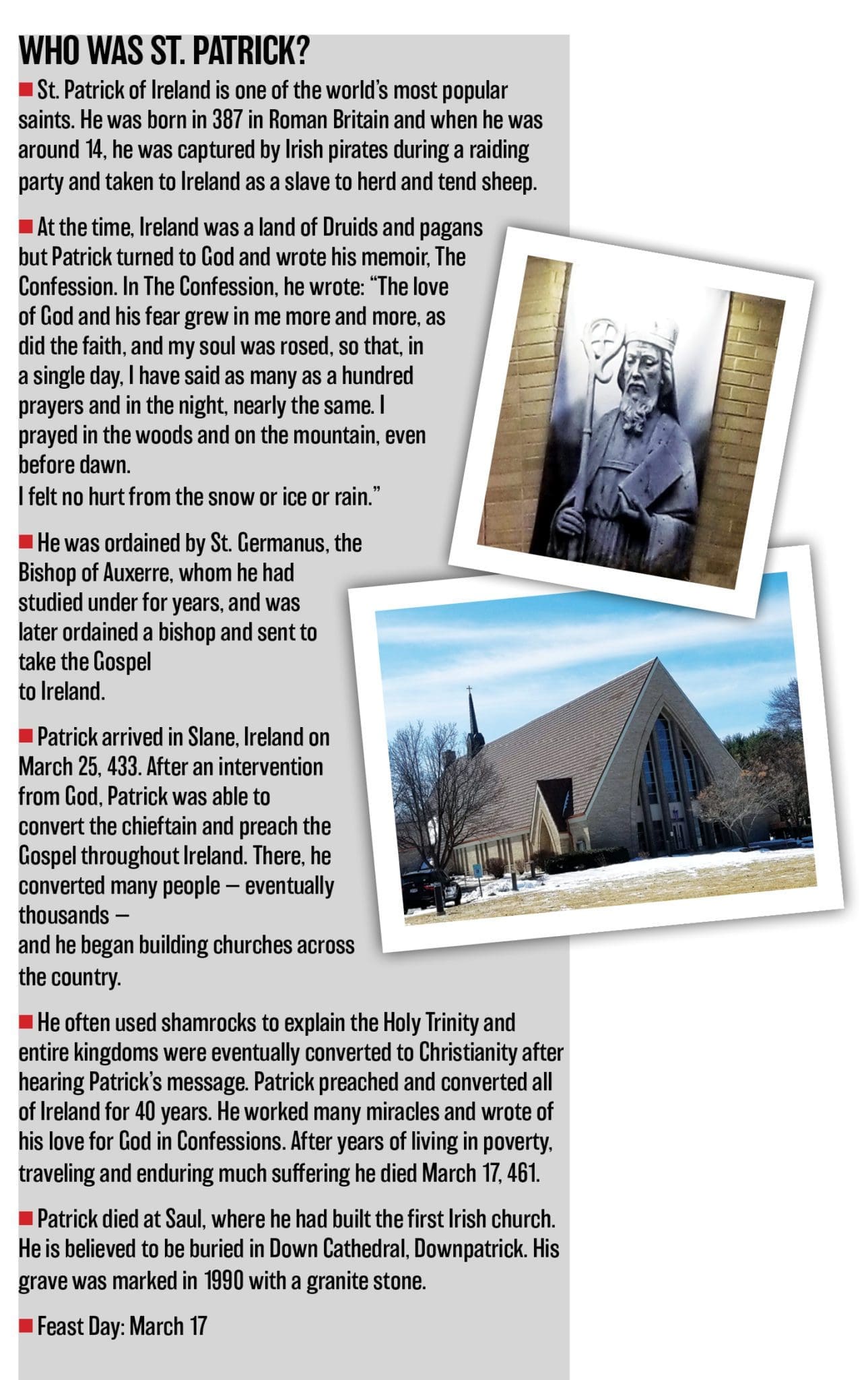 “On the one hand, you have the physical structure so you have a beautiful building,” said Fr. Niehaus. “The church, the rectory and the parish offices were all built at the same time. Fr. Thomas Berry’s name ought to come up often because he’s the one who built all of these at the same time. It’s just a really warm, hospitable community and I was very well received. There’s also the aura of St. Patrick and we know who he was, not just as a historical, Irish-based (man) but also as a saint who can be an inspiration for us. St. Patrick had real pride in Ireland. He was an Englishman who was a slave in Ireland and escaped but went back to Ireland to share the good news of the Gospel.”