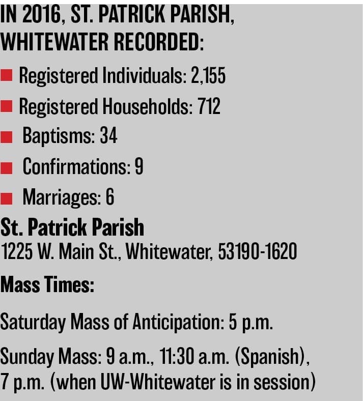 “This is my home parish and I know everybody here,” said Kathy Bolchen, a parishioner for 68 years and counting. “Luckily, I met a Catholic gentleman and we decided to settle here. Our children have been raised in this church and it’s truly home to us. St. Patrick’s Parish is very welcoming. We have a diversity of people who attend here, including university students, the townspeople of Whitewater and we have a large Hispanic population. Everyone is welcome.”