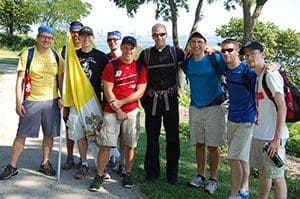 Fr. Luke Strand and a group of men interested in the priesthood pose near Lake Michigan at the beginning of their pilgrimage from Saint Francis de Sales Seminary, St. Francis, to Holy Hill, Hubertus, July 18-20. This is the second summer the seminary has participated in such a walk.