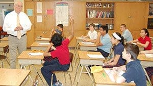 John Keane quizzes his St. Matthew School, Oak Creek, eighth graders during class on Jan. 23. Keane, who has taught at the school for 45 years, plans to retire at the end of the current school year. (Catholic Herald photos by Ricardo Torres)grade teacher and former student of Keane, described his teaching style.