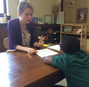 Rising Stars tutor, Catherine Dulan, also a Mount Mary University student, works with student, Nasir Mitchell, at St. Catherine School, Milwaukee, on May 9. (Submitted photo courtesy Mary Newton)When her first students arrived, Guardia guided them through last night’s math homework on probabilities. Seventh-graders Aja Jerkins and Camaya Burkes said they find it easier to learn in a quiet, focused environment with one-on-one attention from their tutor.
