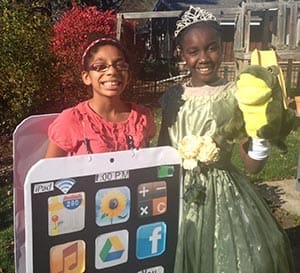 Jamie, 11, an avid gum chewer, went as a bubble gum machine last Halloween, and Liam, our techy kid, was a robot early on. Bill and I don’t like to spend much money on Halloween costumes, preferring to allow the kids to scrounge something together from the way-too-much stuff we have laying around the house.Jamie Scobey-Polacheck is an iPad this Halloween, while her sister, Teenasia, is the Disney princess Tiana. (Submitted photo by Annemarie Scobey-Polacheck)