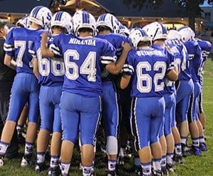 The Fond du Lac St. Mary’s Springs Ledgers football team gathers for a pregame prayer prior to its game against the Lomira High School Lions on Sept. 18. St. Mary’s Springs won the contest, 55-15. (Catholic Herald photo by Steve Wideman)prayer read before every Ledger game: