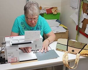 Grace Fabisch creates fabric purses in her home on Oct. 4. which she will also donate to Project Return. The bags will be filled with personal items and given to female ex-offenders. (Catholic Herald photo by Peter Fenelon)Fabisch, a wife, mother and grandmother, was driven to finish the quilt she had received from Sr. Aloyse Hessburg, a School Sister of Notre Dame, working at Mount Mary College in Milwaukee.