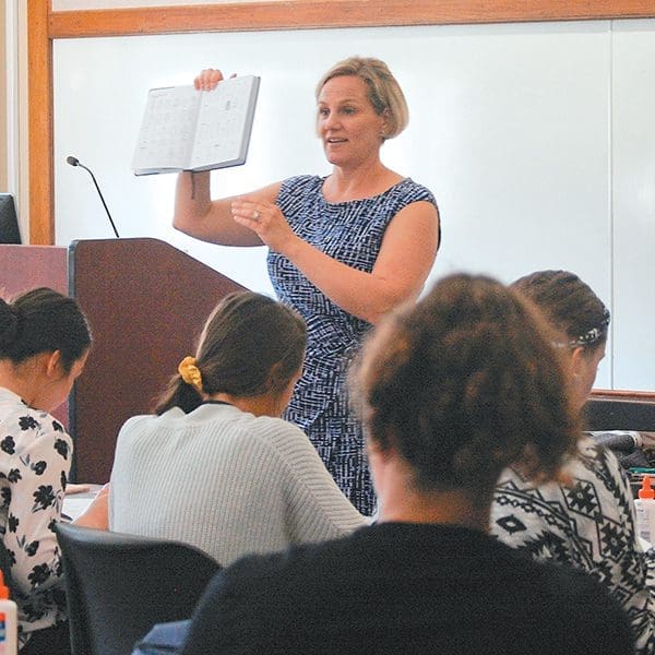 Brenda Schmidt, adjunct professor of fashion design at Mount Mary University, instructs high school girls how to sketch during a session of the university’s Summer Leadership Academy.