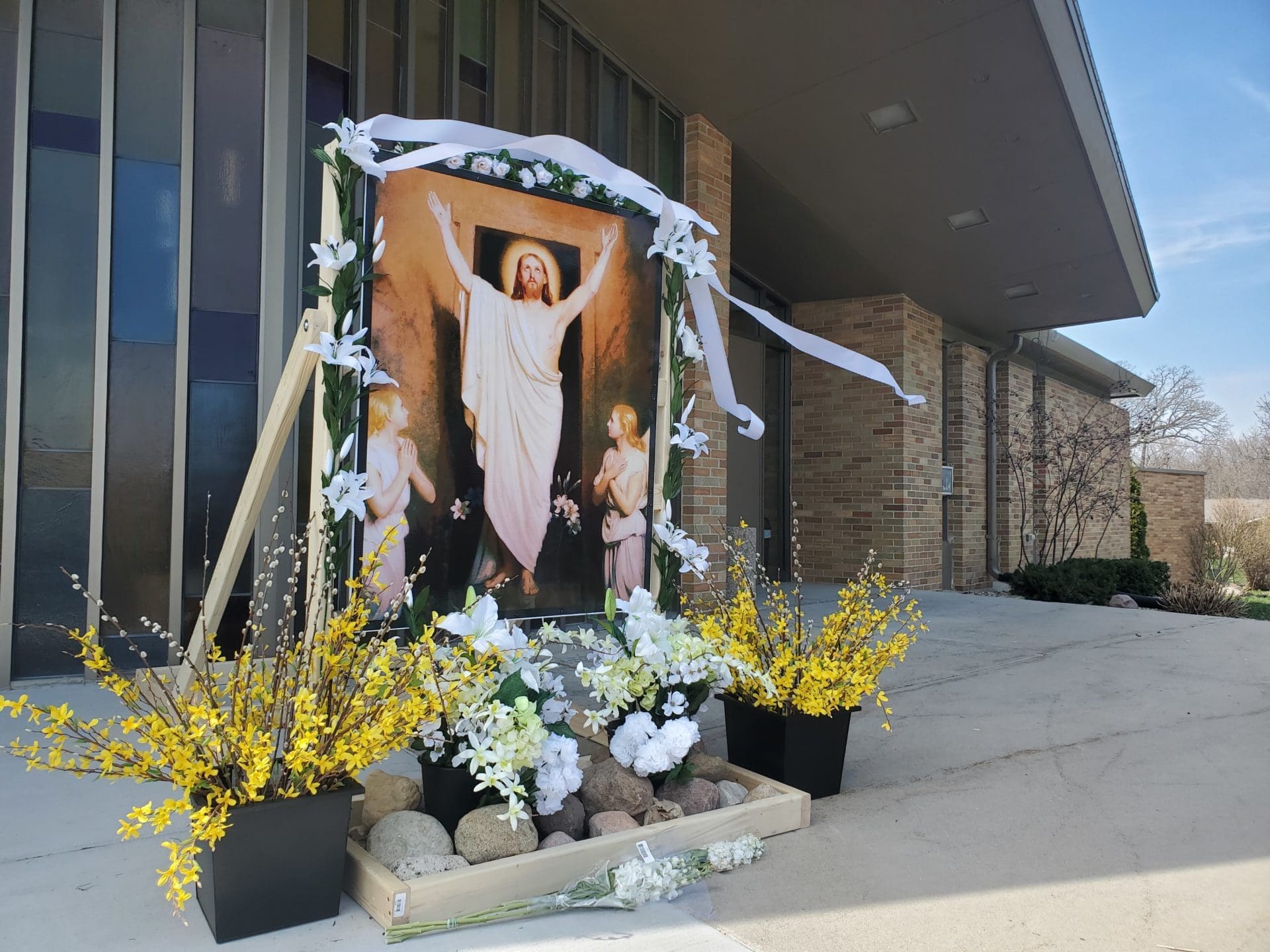 After consulting with staff members, Fr. Arnett decided to have a shrine at each parish so parishioners could drive by or stop and pray while still practicing appropriate social distancing. A close friend of his built the frames and members of the Art and Environment committees decorated them. Each 6-foot-high shrine was decorated and had an image of the resurrected Jesus on the front. While Fr. Arnett initially thought of using church statuary in the shrines, he opted instead to use the images of the resurrected Christ.