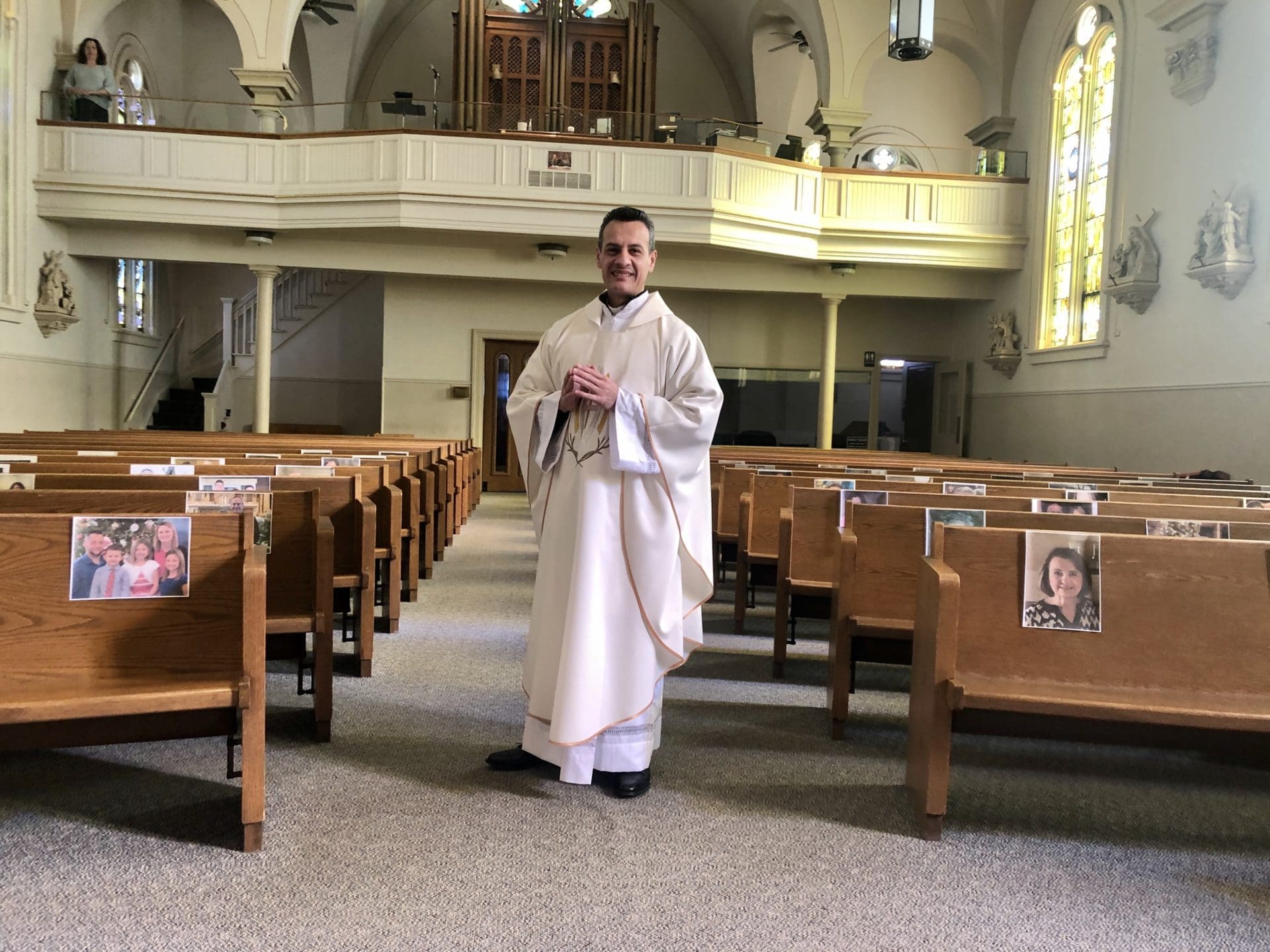And because they knew that Fr. Blanco was missing having his parishioners in the congregation, St. Louis finance council chairperson Steve Goodrich, trustee/treasurer David Mudry and director of the parish office Deanne Auber coordinated a surprise for him — posting photos from parish families in the church pews so Fr. Blanco can see their faces as he celebrates Mass.