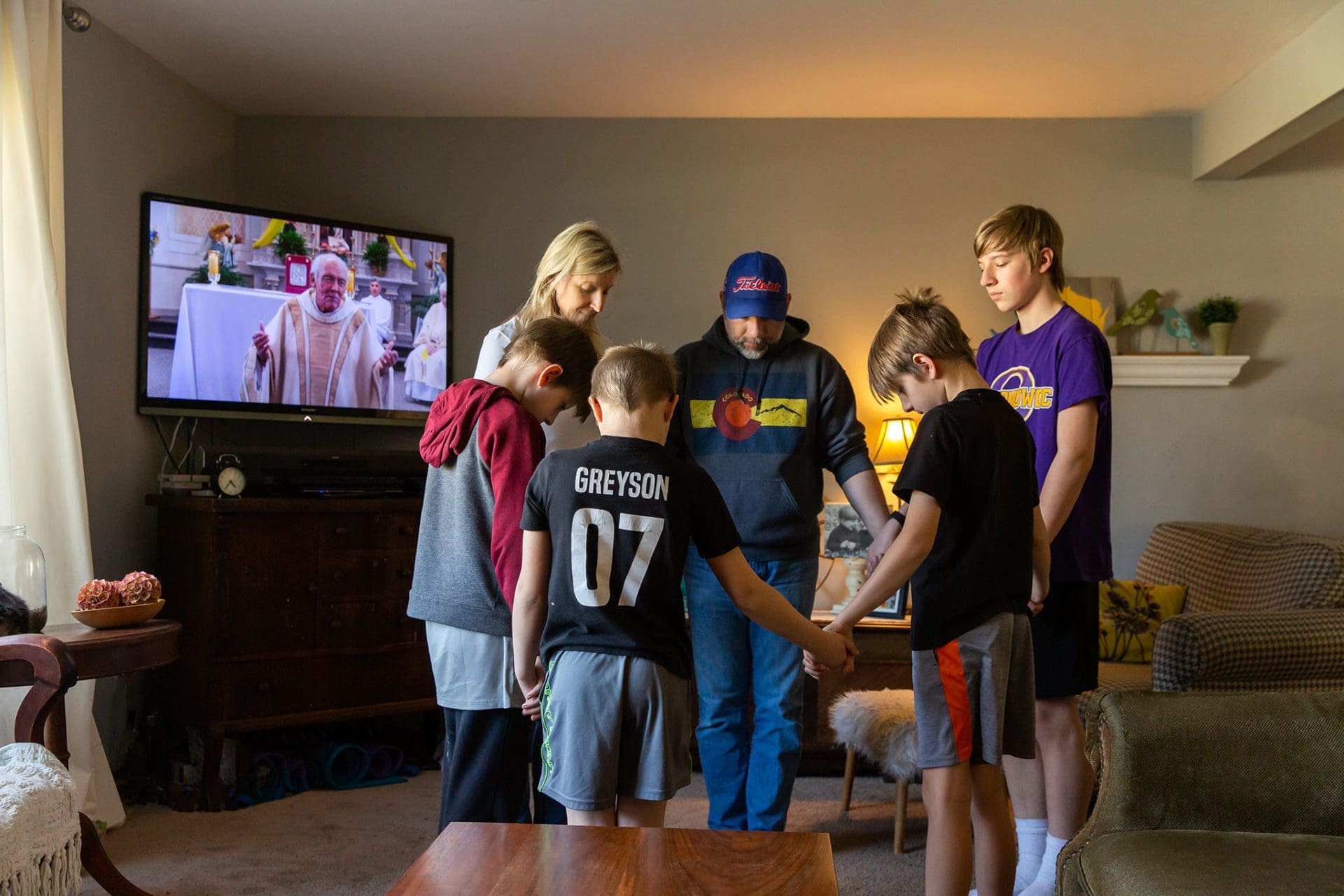 Julie and John Collins pray with their four children (Hunter, 15; Tyler and Brody, 10; and Greyson, 8) while watching Mass on television. (Submitted photo)