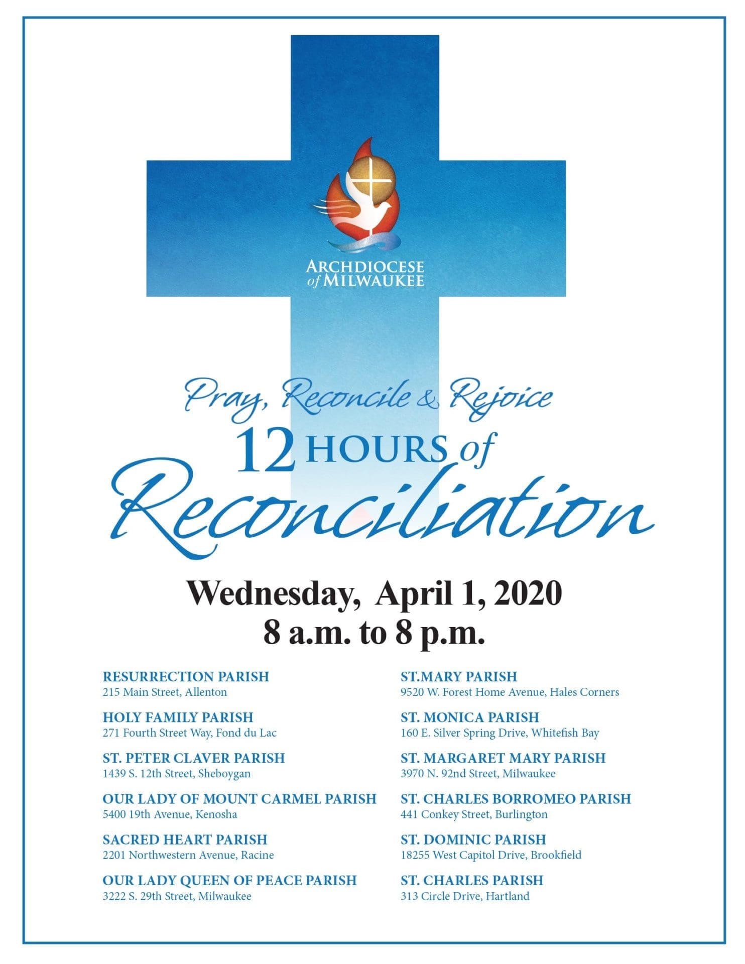 In its second year, Pray, Reconcile and Rejoice: 12 Hours of Reconciliation will take place from 8 a.m. to 8 p.m. Wednesday, April 1, at 12 host parishes within the archdiocese.