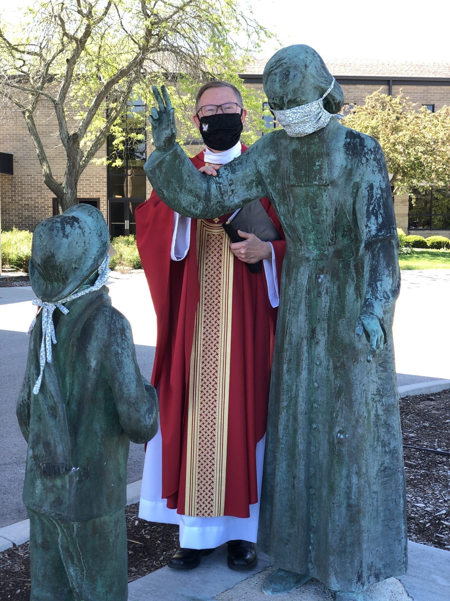 Fr. Ed Kornath, pastor of St. John Vianney Parish in Brookfield, had some fun with the statues of his parish’s patron saint outside, ensuring that even the great saint complied with CDC guidelines. (Submitted photo)