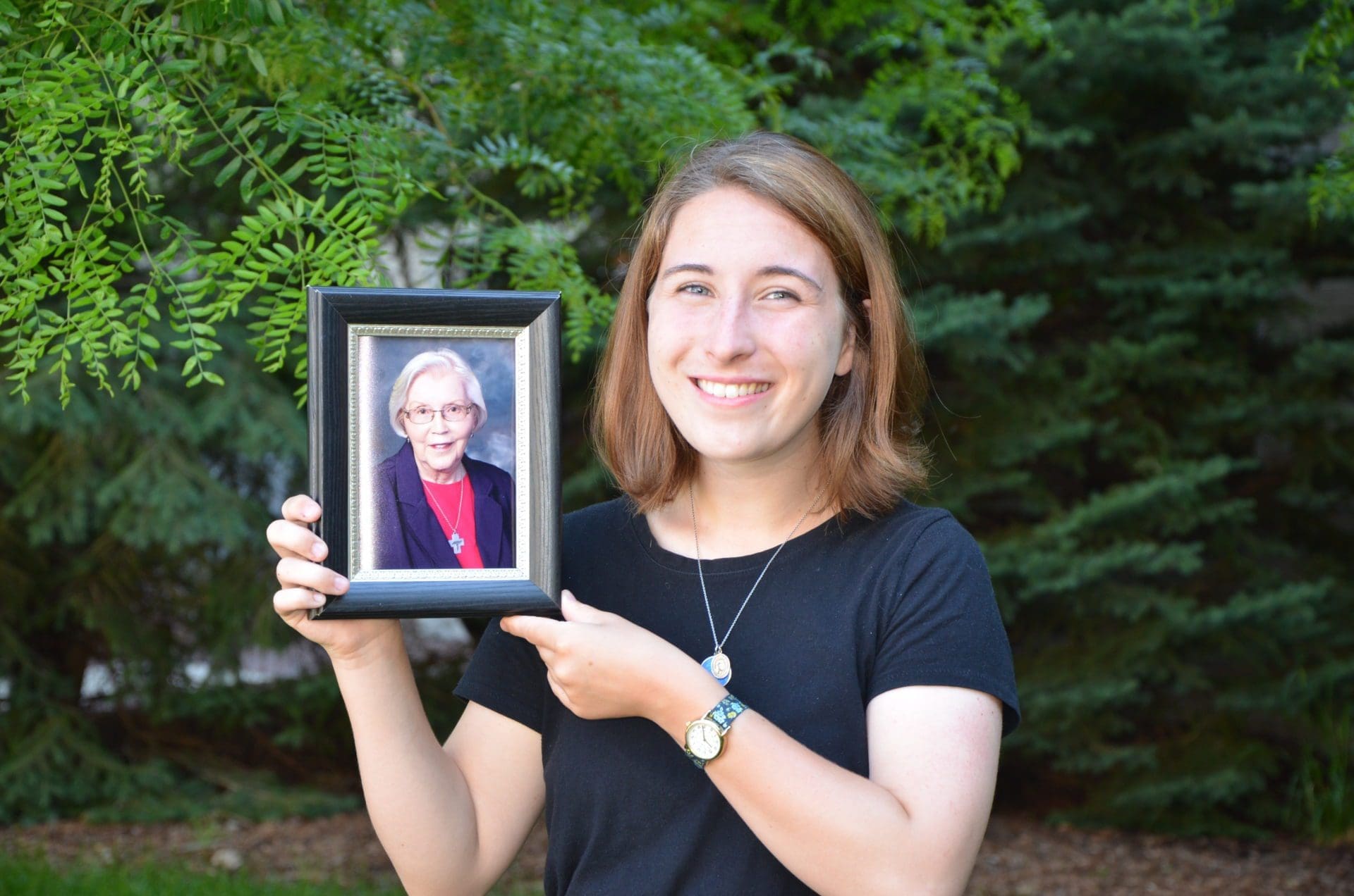 Grace Parlier holds up a picture of Sr. Barbaralie Stiefermann; they haven’t been able to see each other during the coronavirus pandemic. (Submitted photo)