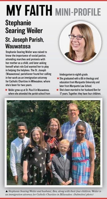Part of it, for sure. I originally went into law school thinking I wanted to work in the district attorney’s office or in the public defender’s office, but when I was in my second or third year of law school and while I found it very interesting, it wasn’t for me. I got an internship at a large law firm and was there for a while but started staying home when we had kids. I was home for over 10 years but then a friend of our family, who volunteers at Catholic Charities in their refugee and immigration services department, mentioned that there was an opening. It was exciting that after that many years, I was able to put it all together and practice law in such a meaningful way.