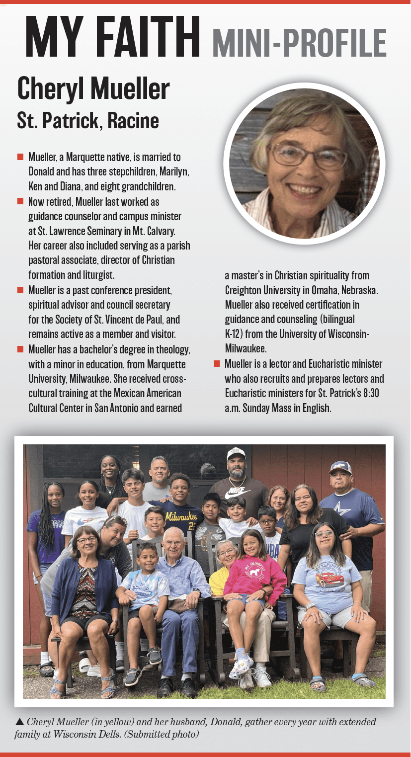 • Now retired, Mueller last worked as guidance counselor and campus minister at Lawrence Seminary in Mt. Calvary. Her career also included serving as a parish pastoral associate, director of Christian formation and liturgist.
