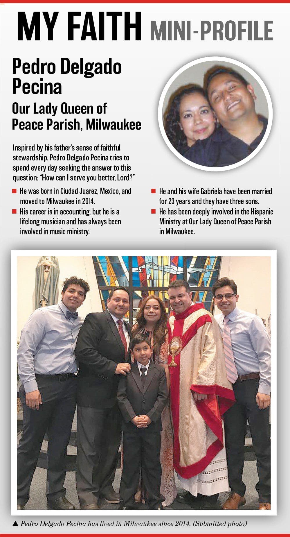 We moved to Milwaukee in 2014 for my job, and I originally found a bilingual Mass at St. Francis of Assisi. Since I live in Brookfield, we were looking for something during the week, too, and found St. Joseph in Waukesha. I began to do the music for bilingual Adoration and Mass during the week there, when Fr. Javier Bustos was at that parish. Then Fr. Bustos was transferred to Our Lady Queen of Peace, to help develop the Hispanic Ministry at that parish. He said, “I need you to be a fellow missionary with me.” The ministry at that parish has flourished very beautifully. The Lord has blessed us with a lot of conversions and people seeking God and finding God.