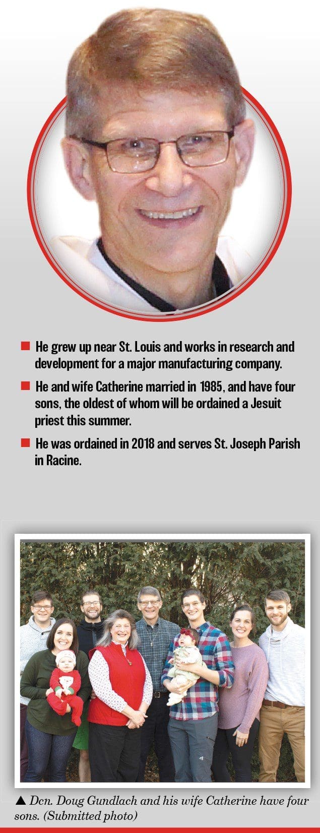 After our fifth anniversary, Catherine and I went on a Marriage Encounter weekend. From there, through Christ Renews His Parish and Cursillo retreats, our spiritual lives really grew. I also got heavily involved in RCIA in the parish. Before we moved here to Wisconsin for my job, Catherine had been accepted to a lay ministry formation program in our old diocese, so when we moved here, she and I went to an open house at the seminary to check out their formation program for lay ministry, which, at the time, was combined with the program for the diaconate. After the open house, I told her, “Don’t be surprised if in 18 years I ask you for your support in pursuing this.” At the time, we were expecting our fourth son and I was fearful of overloading family life. But come 2012, I just felt this nudge from the Holy Spirit saying: “It’s time; look into this.”